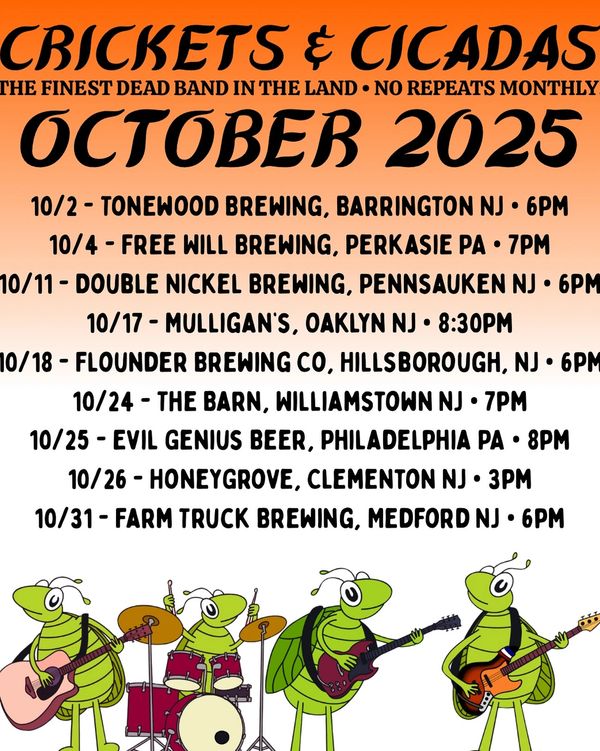 Crickets & Cicadas is a NJ/PA-based Grateful Dead collective known for delivering powerful, improvisation-rich performances. They use the Grateful Dead’s catalog as a launchpad, blasting off into wild, unexpected jams that stretch the imagination. Just when you’ve forgotten what song they started with, they guide you gently back, landing you right where it all began, but with your mind blown wide open.
